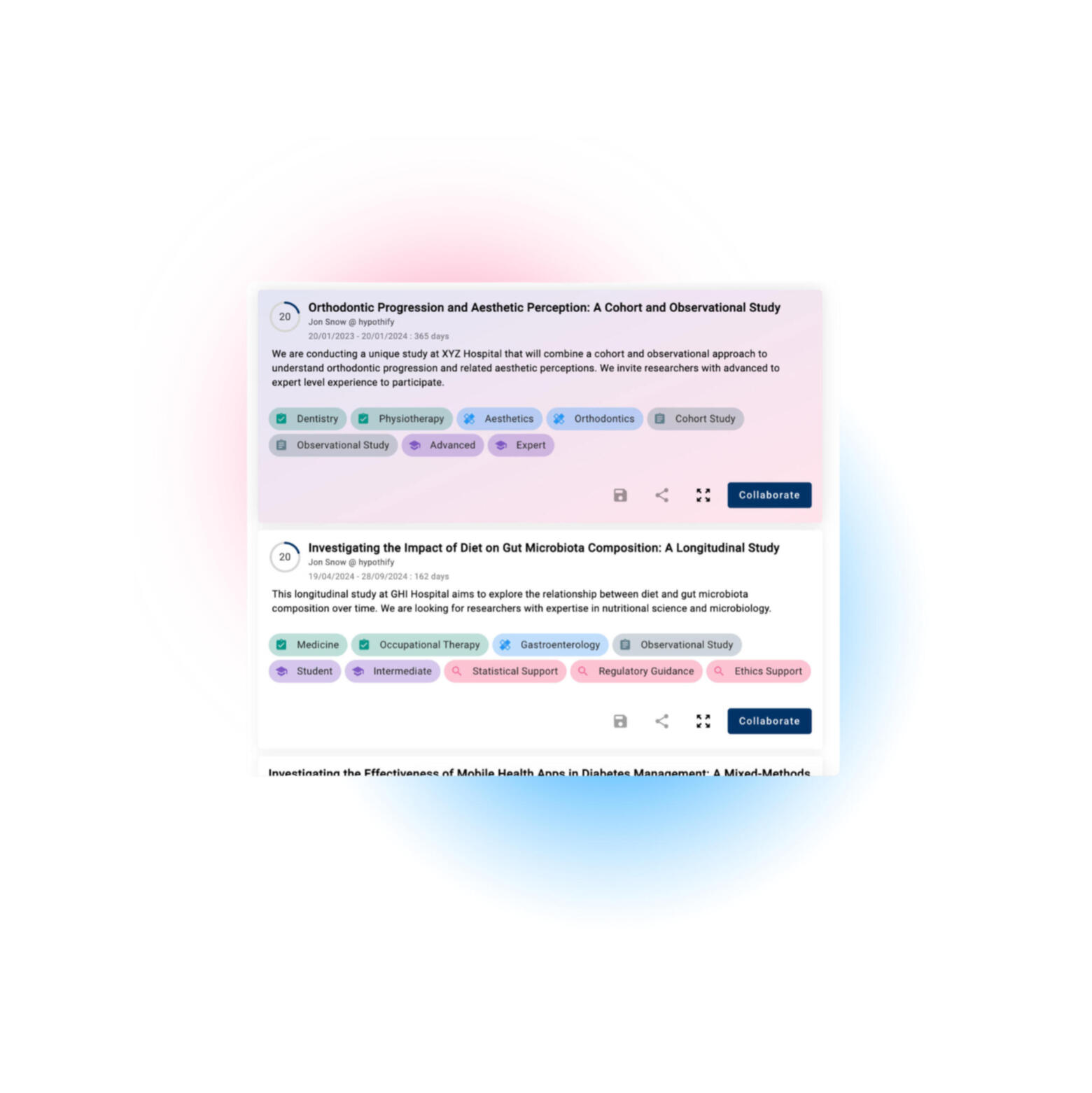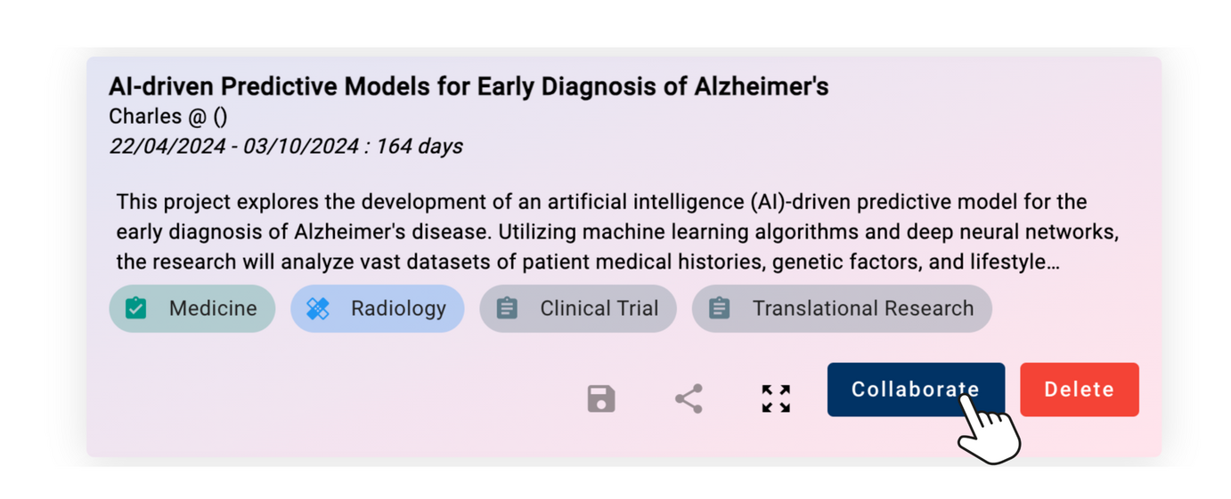 Our platform enables users to initiate collaborations effortlessly, connecting researchers and healthcare professionals across various projects within an research community.