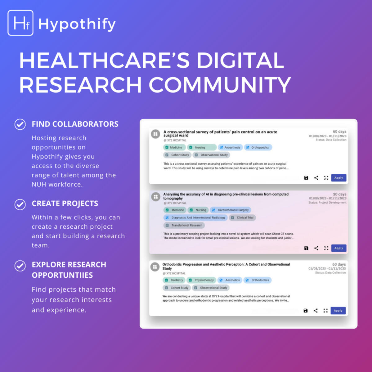 Hypothify is working towards testing our platform among frontline healthcare professionals, academics and students.Our pilots will seek to support healthcare teams in the formation and delivery of research projects. Helping to open up opportunities to a greater range of professionals than ever before.