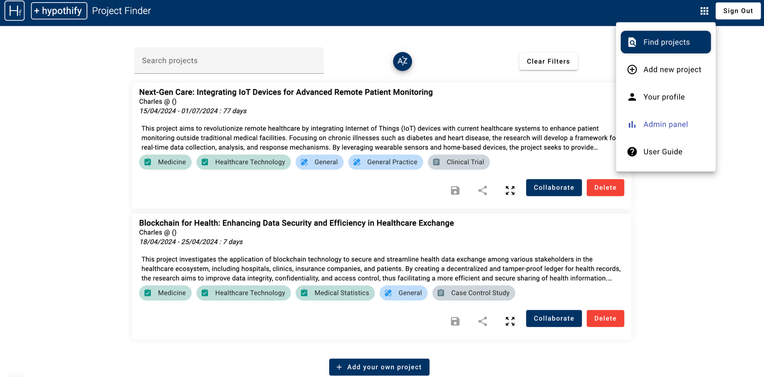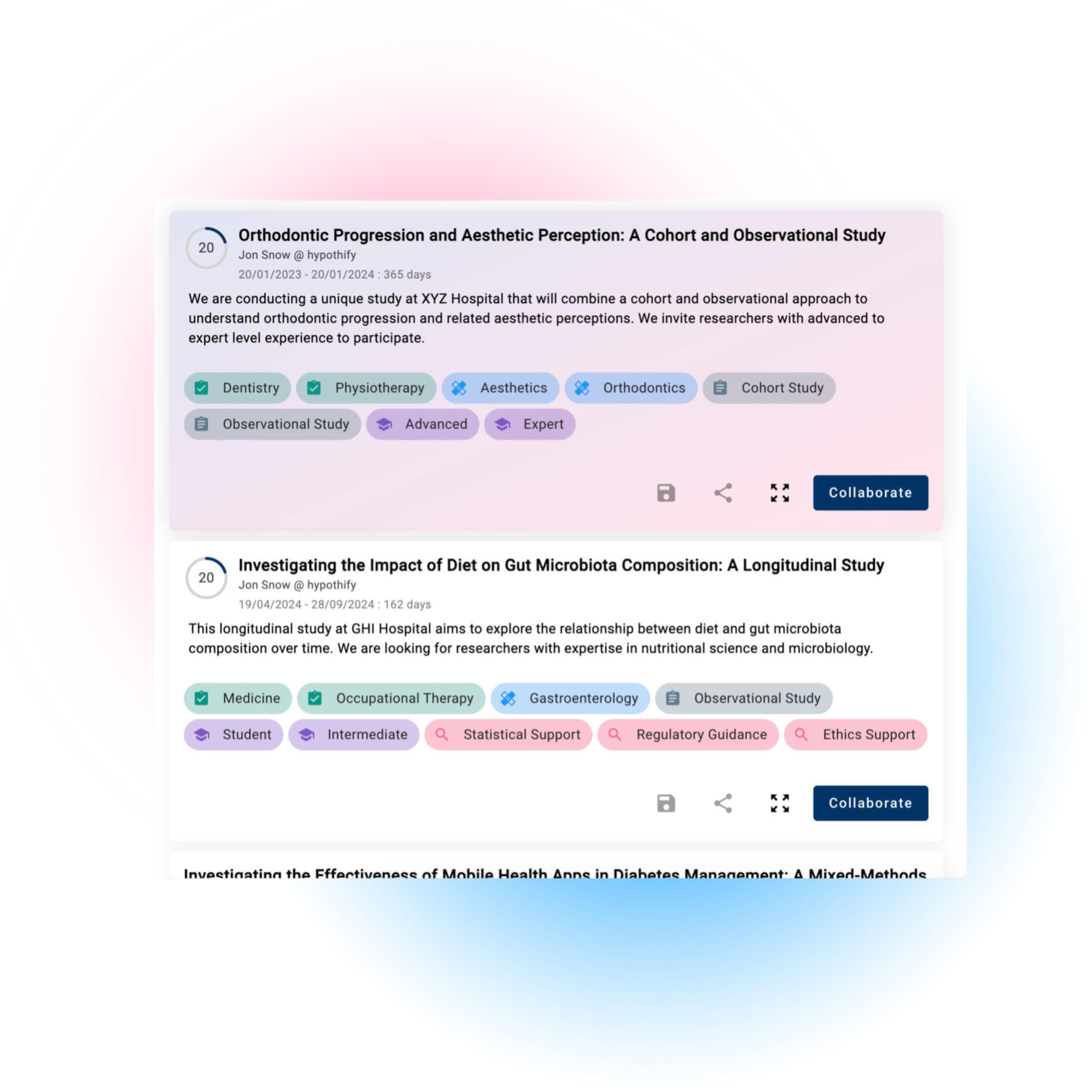 Our platform enables users to initiate collaborations effortlessly, connecting researchers and healthcare professionals across various projects within an research community.